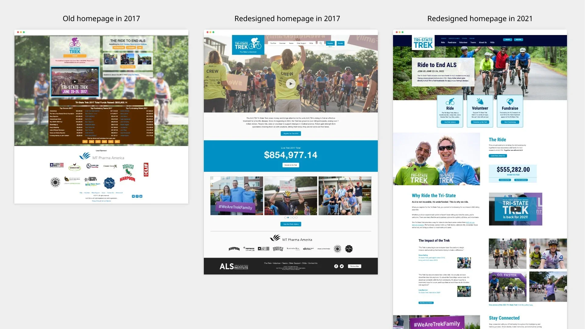 Tri-State Trek is ALS TDI’s largest annual fundraising event, raising more than $10 million for ALS research. I redesigned the event website to better reflect its impact, simplify participation, and help cyclists, donors, and volunteers easily register, fundraise, and prepare for the multi-day ride.